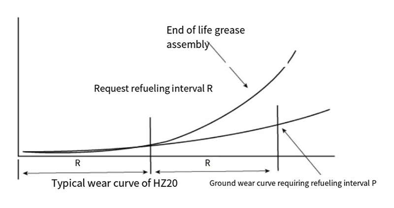 Når HZ20 bøsning er installeret med påføring af fedt som lithiumbaseret eller silikonefedt. Dens levetid varierer fra PV-værdien under driftstilstand. for eksempel. når PV-værdien er omkring 2,5 MPam/s. dens levetid vil være omkring 200 timer; når PV-værdien er 0,1Mpa-m/s, kan dens levetid være over I0,0oohr (se tabellen for detaljer). Cyklus R for smørevedligeholdelse af HZ20 bøsning er omkring halvdelen af dens levetid. For eksempel, når PV=25Mpam/s. det er påkrævet at blive oliesmurt hver 100 timer.
